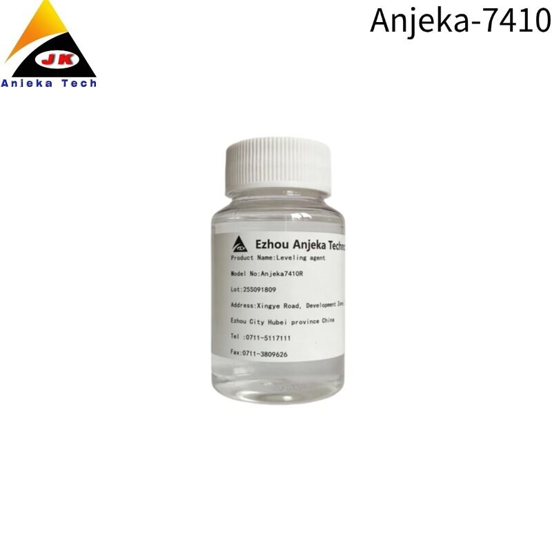 Anjeka-7410 is a silicone leveling agent with defoaming properties. It slightly reduces the surface tension of coatings, thus improving flow and leveling and exhibiting partial defoaming properties and preventing the formation of Bernard swirls.